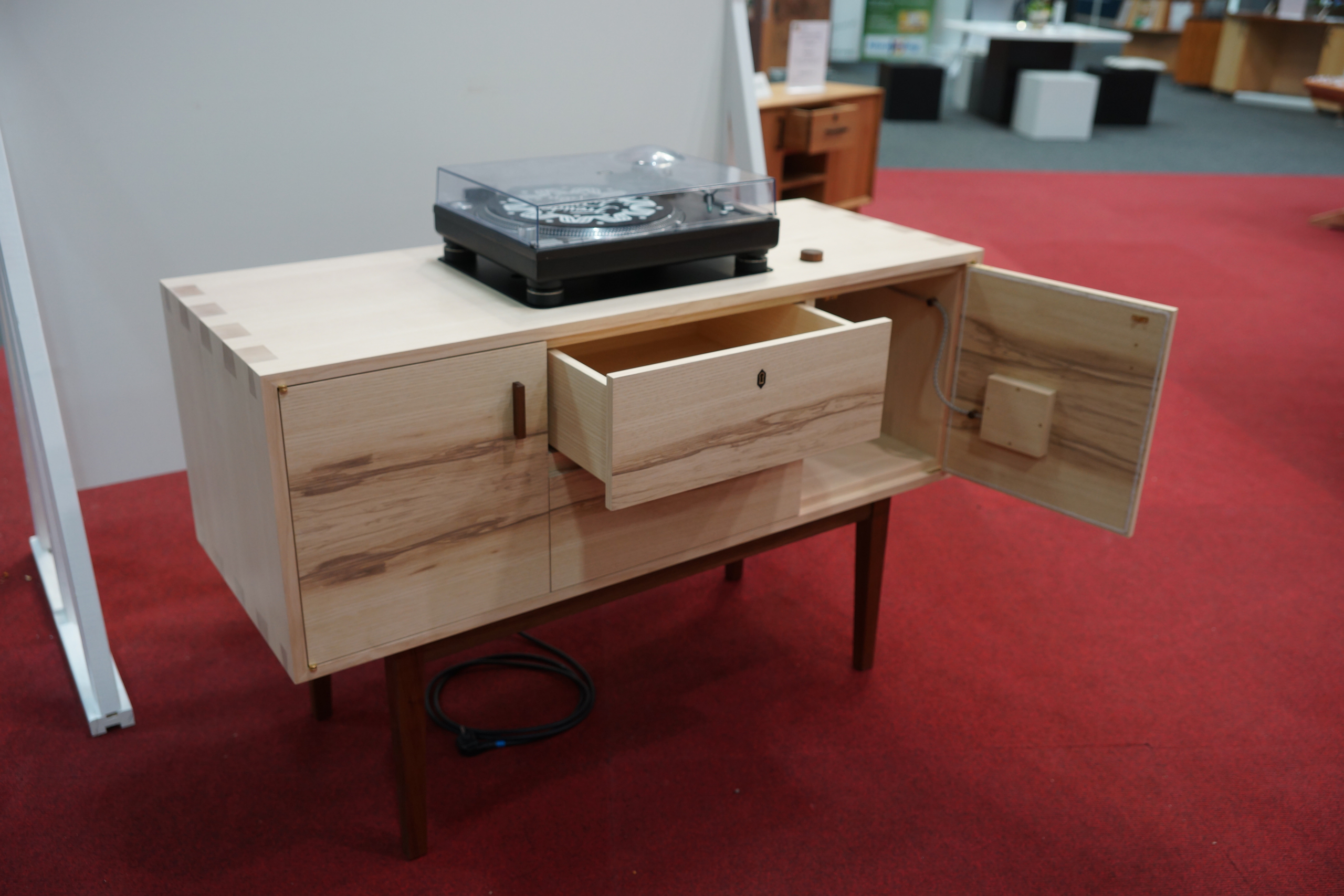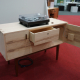 Ein hochwertig gestaltetes Möbel mit entkoppelter Plattenspielerauflage, integriertem Verstärker und Lautsprechern sowie Schubkasten, Klappe und Türen. Gefertigt aus Esche, Nussbaum und Kerneschenfurnier.