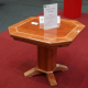 Ein Spieltisch in Form eines unregelmäßigen Achtecks mit markanter Kreuzfuge und Fries. Integrierte Schubfächer dienen als Getränke- und Münzhalter. Ein durchgehender schwarzer Ring bildet das prägende Gestaltungselement. Verwendete Materialien: Birne, Ahorn und Madrona-Furniere.